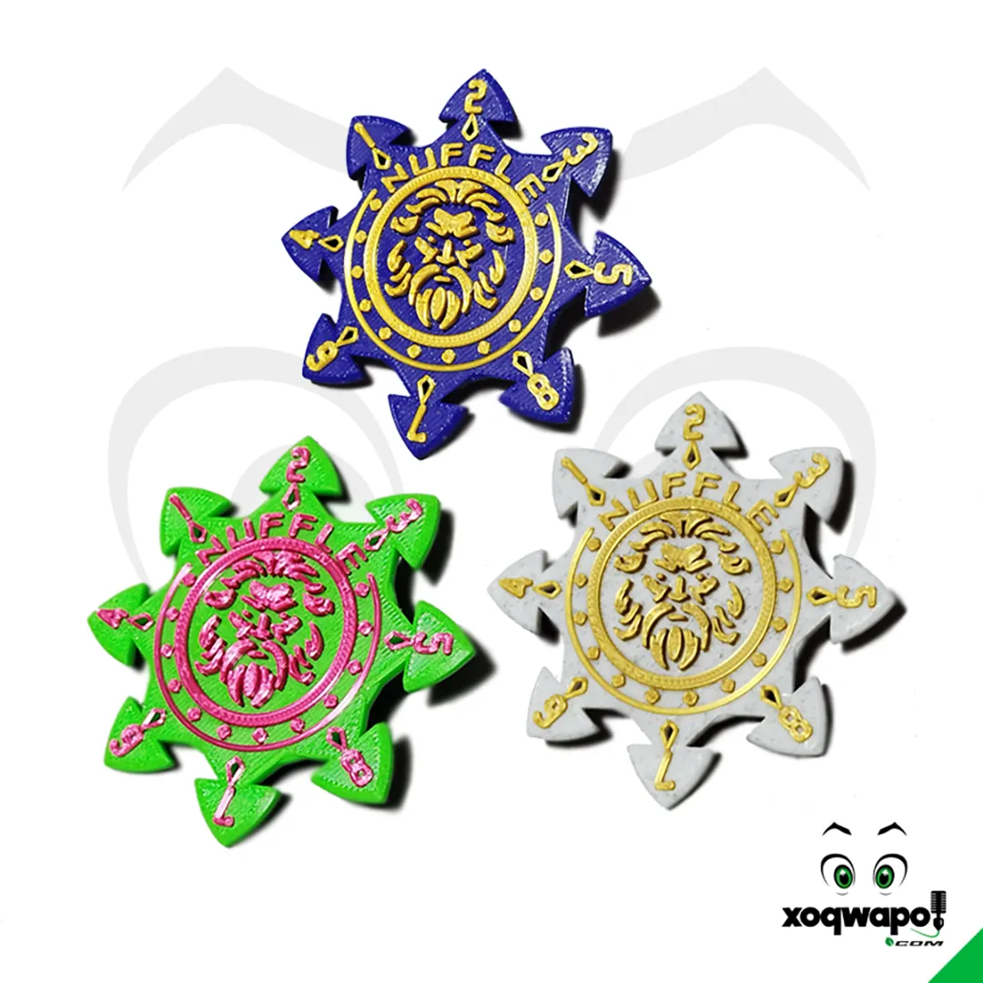 Estas plantillas están disponibles en cualquier combinación de 2 colores que desees y todas tienen como icono central la cara de NUFFLE, que ayudará o no en el azar de tus tiradas de dados.